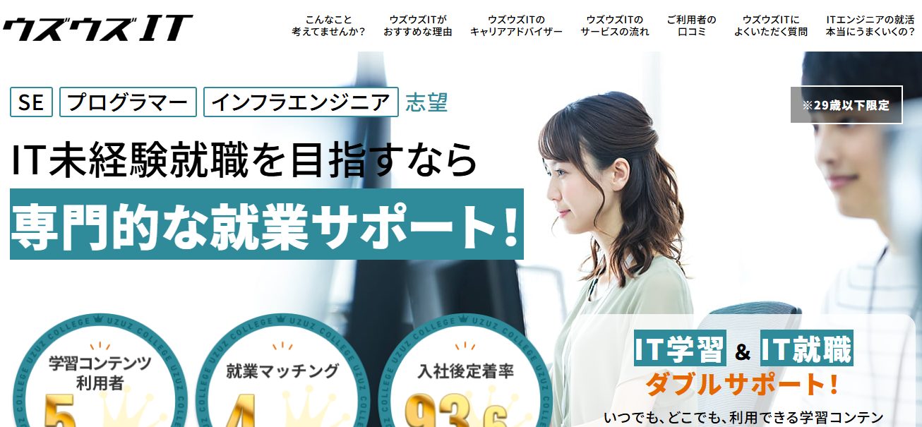 ウズウズITとは、ITエンジニアを目指す20代向けに、学習支援から就職サポート、入社後のフォローまでを無料で提供する特化型就職支援サービスです。未経験でも安心してIT業界を目指せる環境が整っています。