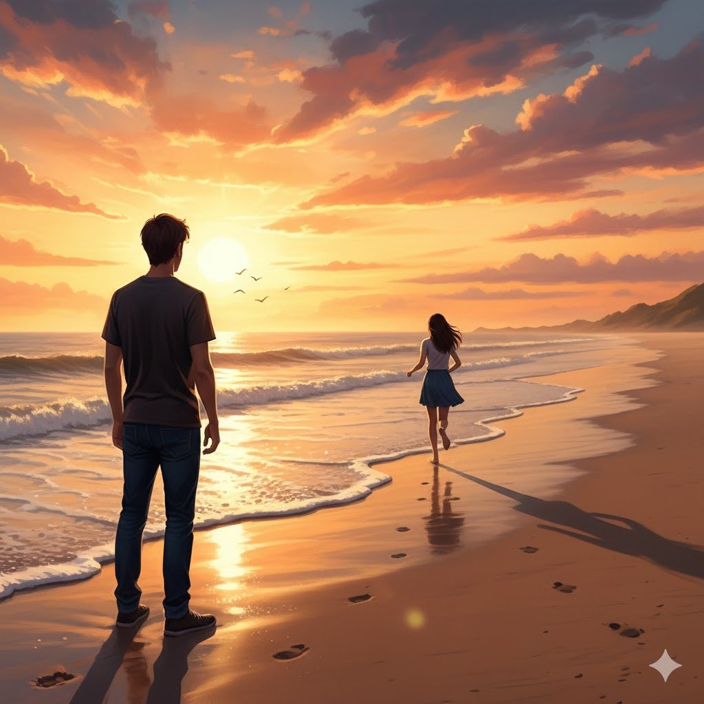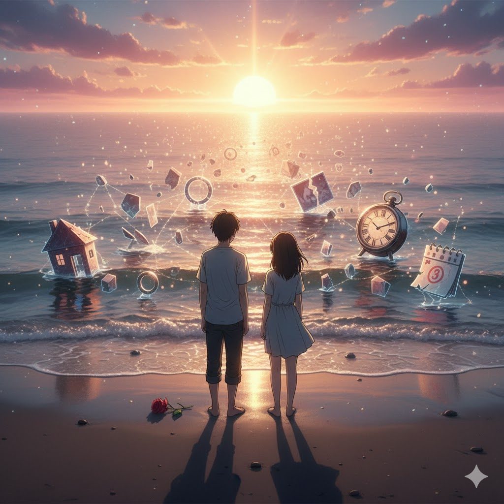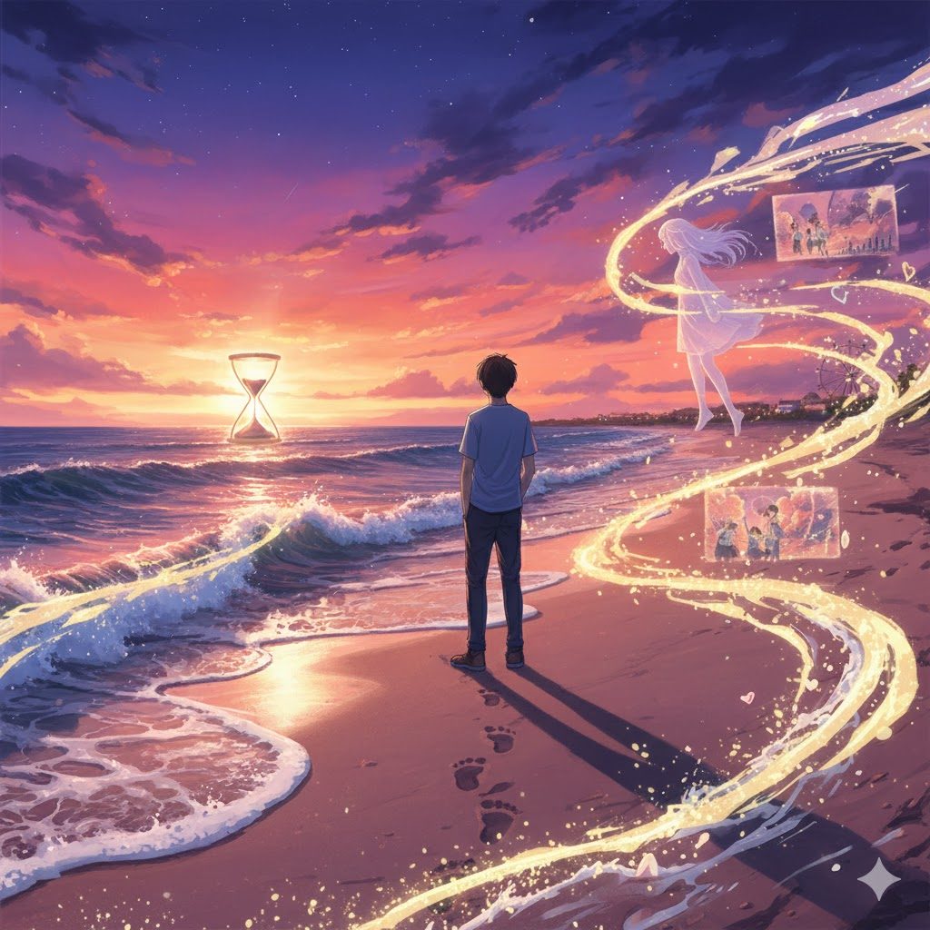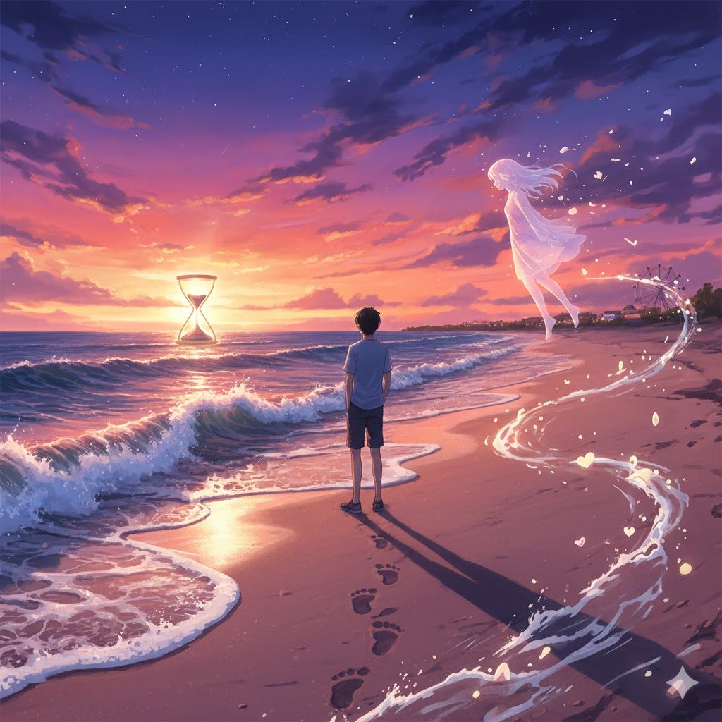 砂浜の足跡——二人で歩いた証。でも、波が来て、消えてしまう。
