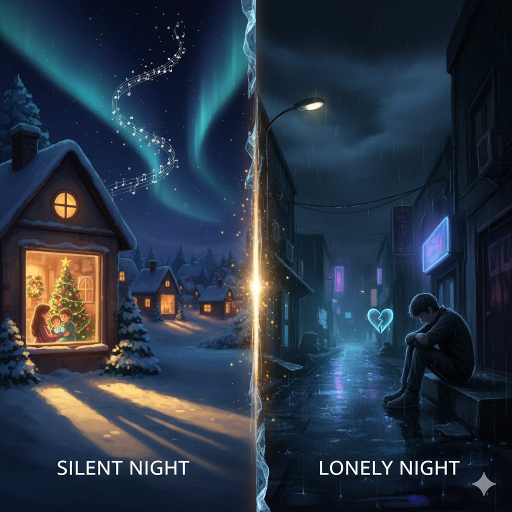「silent silent silent night lonely lonely lonely night」というフレーズの反復が、クリスマスソングの定番「Silent Night(きよしこの夜)」を踏まえながら、その静けさが孤独に転化している様を表現しています。聖なる静けさは、一人でいる者にとっては、ただの孤独です。